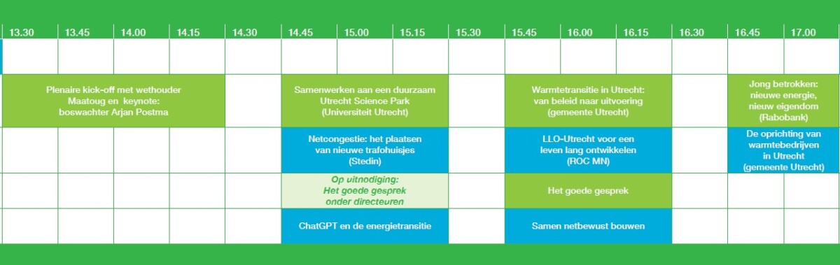 • ‘Hoe-gaat-het-nu-met…-sessies’: Silvester Heijdemann (Stedin) en Jo-Anne Kooijman (gemeente Utrecht) geven een update over netcongestie en gaan in op de afwegingen voor het plaatsen van 800 trafohuisjes in de stad. Albert-Jan Krikke (Tech Campus, ROC Midden Nederland) laat zien hoe de LLO-katalysator leren en werken in de energietransitie versnelt. Mila Verdonk (gemeente Utrecht) en Jort Meijer (Oog voor Warmte) vertellen hoe het gaat met de oprichting van publieke én lokale warmtebedrijven, zoals in Oog in Al.