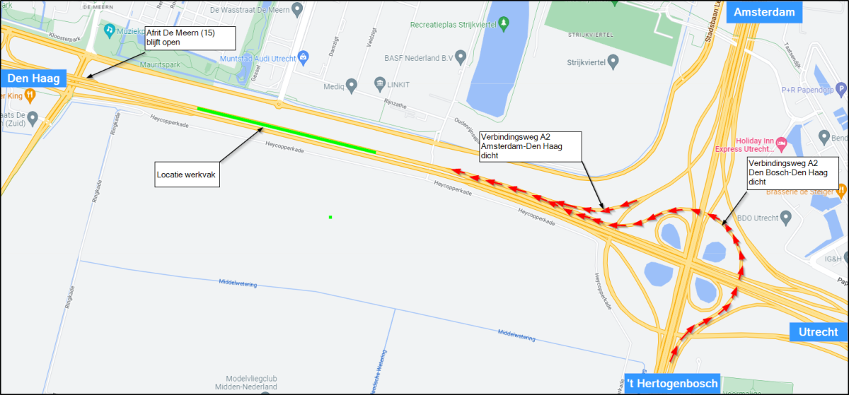 - Het verkeer richting Den Haag en Rotterdam wordt omgeleid via aansluiting Nieuwegein (16). Extra reistijd bedraagt 4 minuten