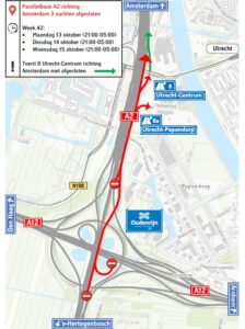 In de nachten van maandag 13, dinsdag 14 en woensdag 15 oktober voert Heijmans, in opdracht van Rijkswaterstaat, onderhoudswerkzaamheden uit op de parallelbaan A2 tussen knooppunt Oudenrijn en afrit 8 Utrecht-Centrum (rijrichting ’s-Hertogenbosch → Amsterdam). Hiervoor is het noodzakelijk de parallelbaan vanaf knooppunt Oudenrijn inclusief afrit 8a Utrecht -Papendorp en 8 Utrecht-Centrum voor al het verkeer in de richting van Amsterdam 3 nachten af te sluiten.