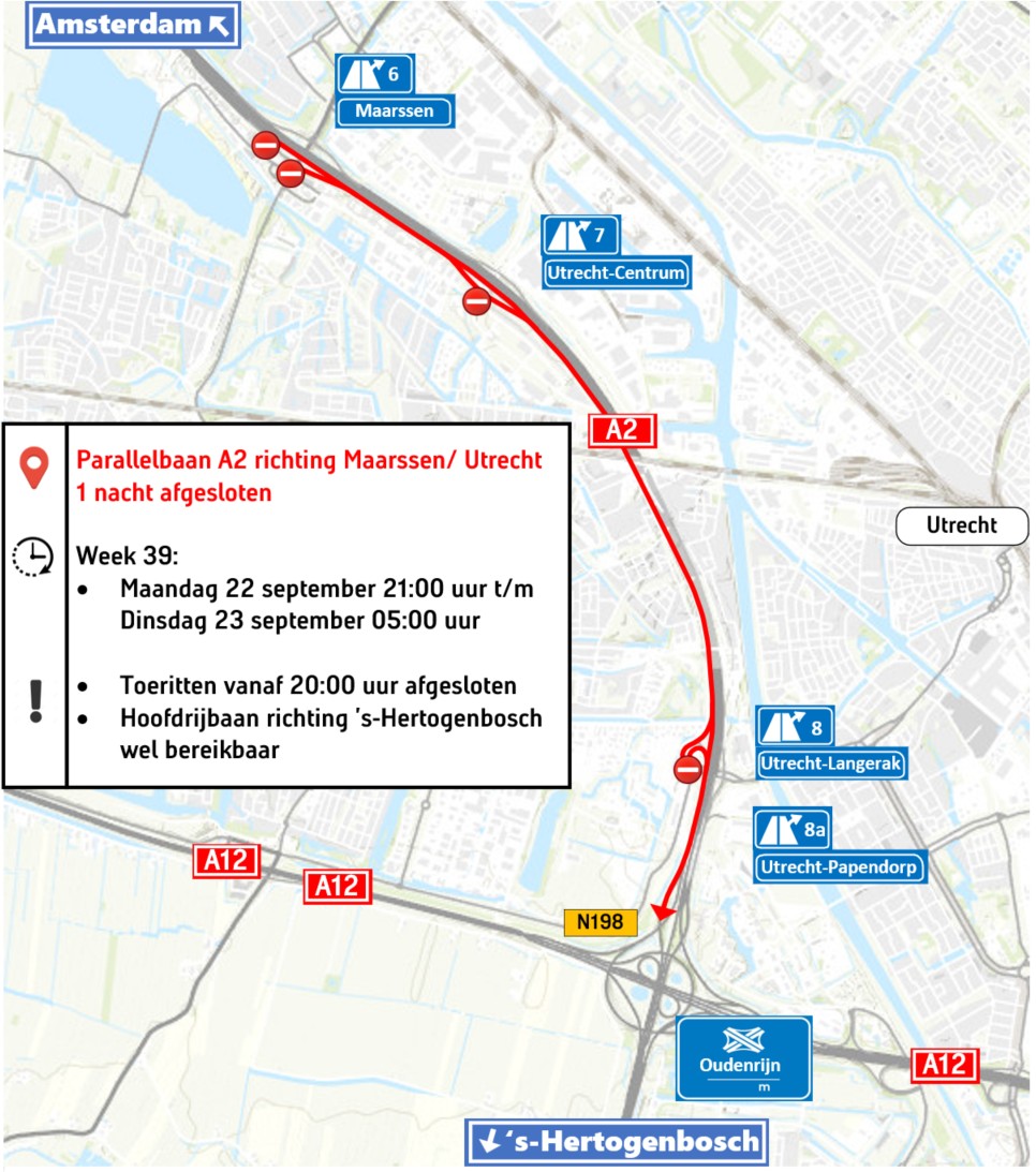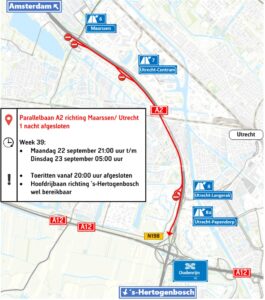 In de nacht van maandag 22 september voert Heijmans, in opdracht van Rijkswaterstaat, onderhoudswerkzaamheden uit op de parallelbaan A2 tussen toerit 6 Maarssen en knooppunt Oudenrijn. Hiervoor is het noodzakelijk de tussenliggende af- en toeritten voor al het doorgaande verkeer in de rijrichting van ’s-Hertogenbosch 1 nacht af te sluiten. De hoofdrijbaan vanuit Amsterdam richting Maastricht/ ’s-Hertogenbosch blijft wel bereikbaar.