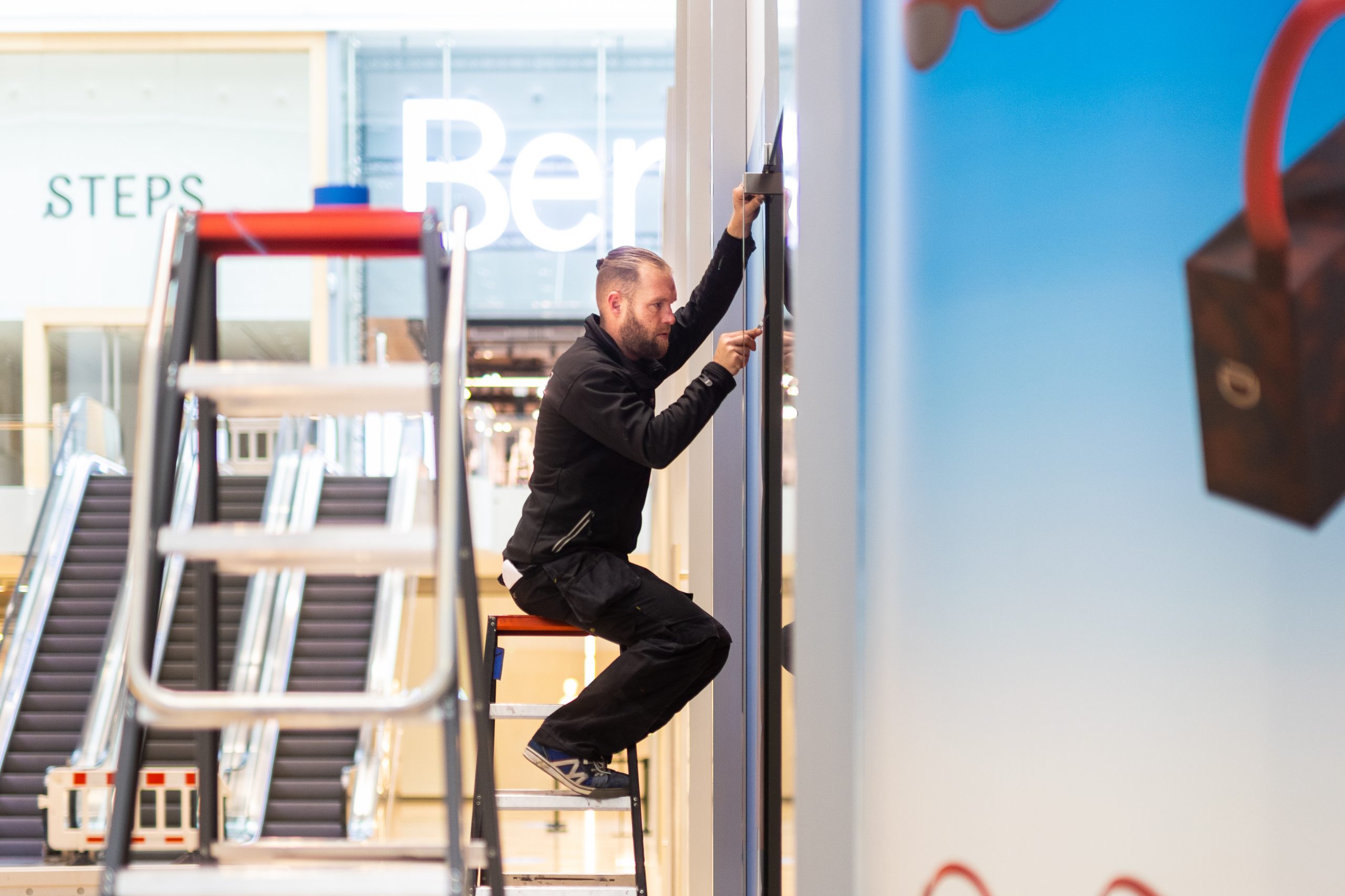 Terug naar Hoog Catharijne, waar tijdens de renovatie de aankleding van Maxtension afkomstig is. “In de passages waar verbouwd wordt zijn geen winkels, maar wel mensen. Een mooie uitdaging om dit aan te kleden en een lach bij de mensen op het gezicht te toveren.” Zo worden winkels van stickers met de toekomstige look voorzien en de passages bekleedt met grote doeken. “De bekendste zijn de doeken met foto’s van oud Utrecht erop, een stukje geschiedenis en herkenbaar voor de Utrechters. Dat springt eruit en onthouden de mensen in plaats van het gevoel te hebben in een bouwput te lopen.” Een aantal keer per week is Maxtension actief op Hoog Catharijne en door corona heeft Maxtension Hoog Catharijne, in de vorm van stickers, voorzien van aangepaste bewegwijzering, huisregels, routing en de bekende leus ‘afstand houden’.